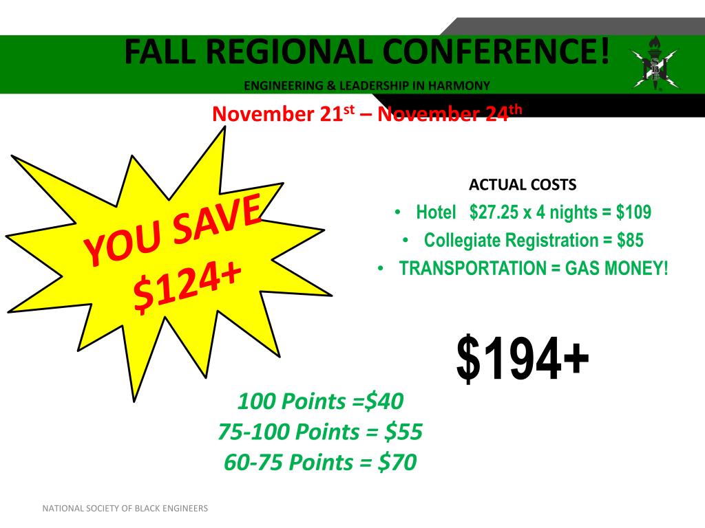 FALL REGIONAL CONFERENCE! ENGINEERING & LEADERSHIP IN HARMONY November 21st – November 24th ACTUAL COSTS Hotel $27.25 x 4 nights = $109 Collegiate Registration = $85 TRANSPORTATION = GAS MONEY! $194+ YOU SAVE $124+ 100 Points =$40 75-100 Points = $55 60-75 Points = $70