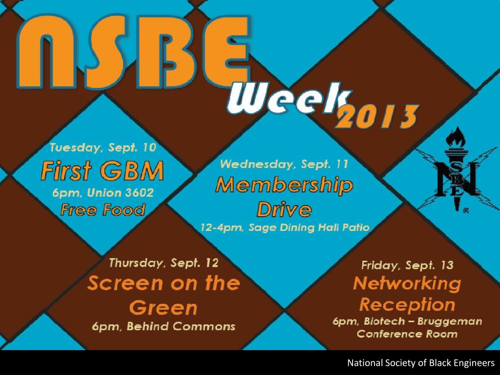 NSBE Networking Reception • This Friday • 6-9pm • Bruggeman Room • Come and mingle and interact with RPI faculty and some corporate representatives from GE! • Business Casual attire • Refreshments/light snacks will be served National Society of Black Engineers
