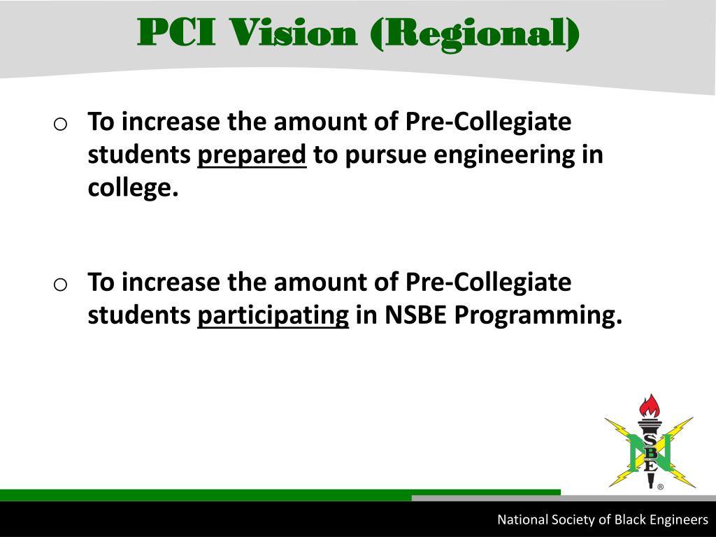 PCI Vision (Regional) • To increase the amount of Pre-Collegiate students prepared to pursue engineering in college. • To increase the amount of Pre-Collegiate students participating in NSBE Programming. National Society of Black Engineers