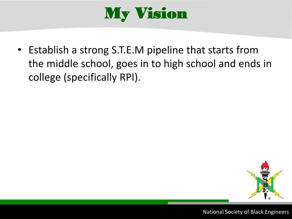 My Vision • Establish a strong S.T.E.M pipeline that starts from the middle school, goes in to high school and ends in college (specifically RPI). National Society of Black Engineers