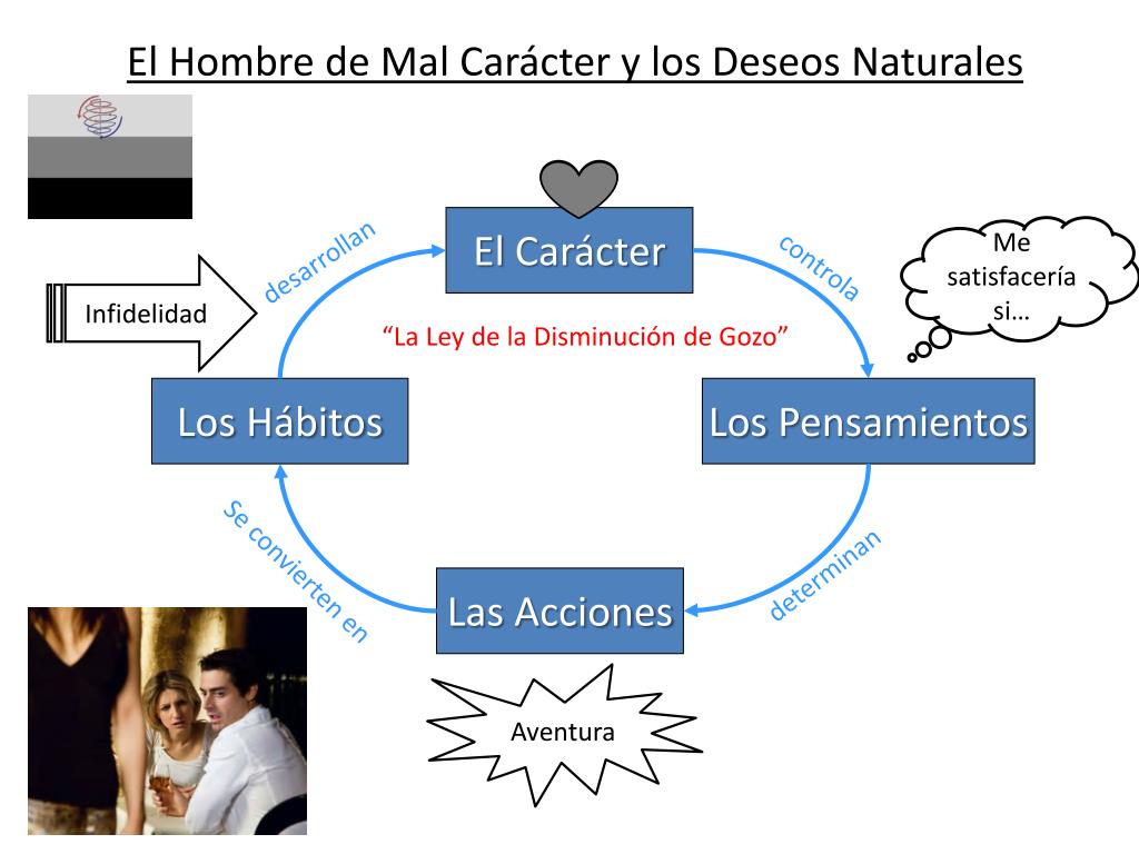 El Hombre de Mal Carácter y los DeseosNaturales El Carácter Me satisfaceríasi… desarrollan controla Infidelidad “La Ley de la Disminución de Gozo” Los Hábitos Los Pensamientos Se convierten en determinan Las Acciones Aventura