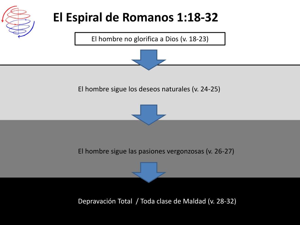 El Espiral de Romanos 1:18-32 El hombre no glorifica a Dios (v. 18-23) El hombre sigue los deseos naturales (v. 24-25) El hombre sigue las pasiones vergonzosas (v. 26-27) Depravación Total / Toda clase de Maldad (v. 28-32)