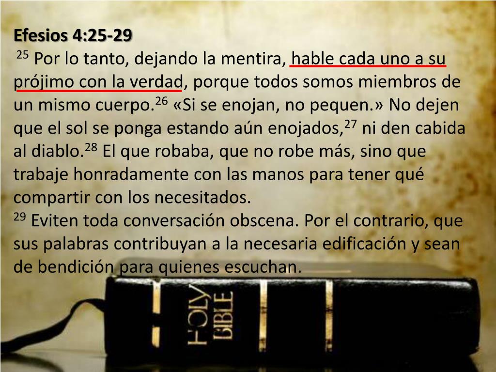 Efesios 4:25-29 25 Por lo tanto, dejando la mentira, hable cada uno a su prójimo con la verdad, porque todos somos miembros de un mismo cuerpo.26 «Si se enojan, no pequen.» No dejen que el sol se ponga estando aún enojados,27 ni den cabida al diablo.28 El que robaba, que no robe más, sino que trabaje honradamente con las manos para tener qué compartir con los necesitados. 29 Eviten toda conversación obscena. Por el contrario, que sus palabras contribuyan a la necesaria edificación y sean de bendición para quienes escuchan.