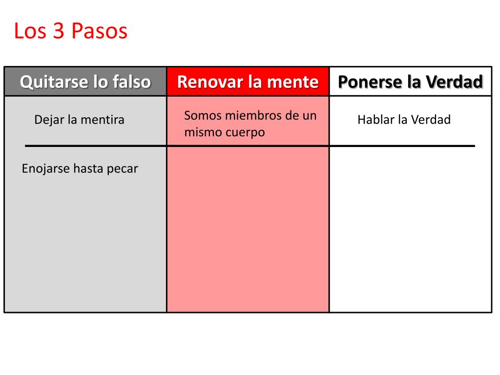 Los 3 Pasos Quitarse lo falso Renovar la mente Ponerse la Verdad Somos miembros de un mismo cuerpo Dejar la mentira Hablar la Verdad Enojarse hasta pecar Perdonar en el día