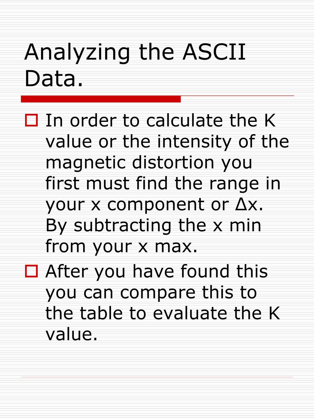 Analyzing the ASCII Data. • In order to calculate the K value or the intensity of the magnetic distortion you first must find the range in your x component or ∆x. By subtracting the x min from your x max. • After you have found this you can compare this to the table to evaluate the K value.