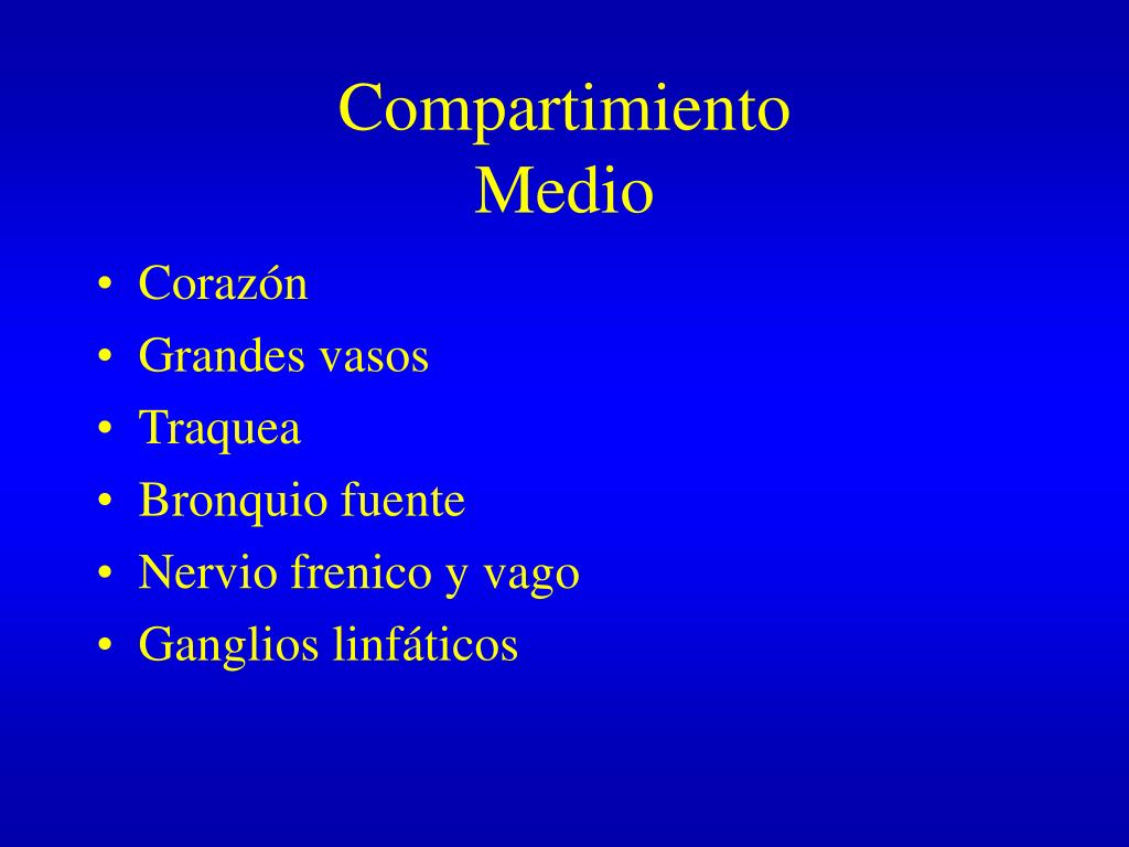 CompartimientoMedio • Corazón • Grandes vasos • Traquea • Bronquio fuente • Nervio frenico y vago • Ganglios linfáticos