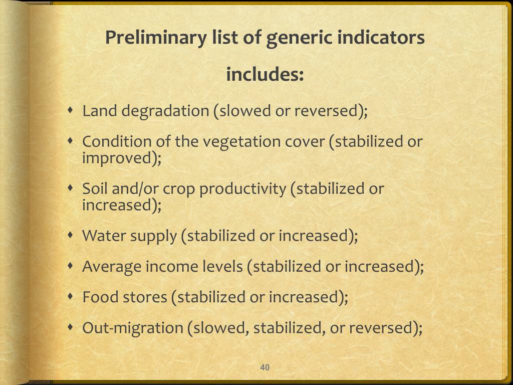 Preliminary list of generic indicators includes: • Land degradation (slowed or reversed); • Condition of the vegetation cover (stabilized or improved); • Soil and/or crop productivity (stabilized or increased); • Water supply (stabilized or increased); • Average income levels (stabilized or increased); • Food stores (stabilized or increased); • Out-migration (slowed, stabilized, or reversed);