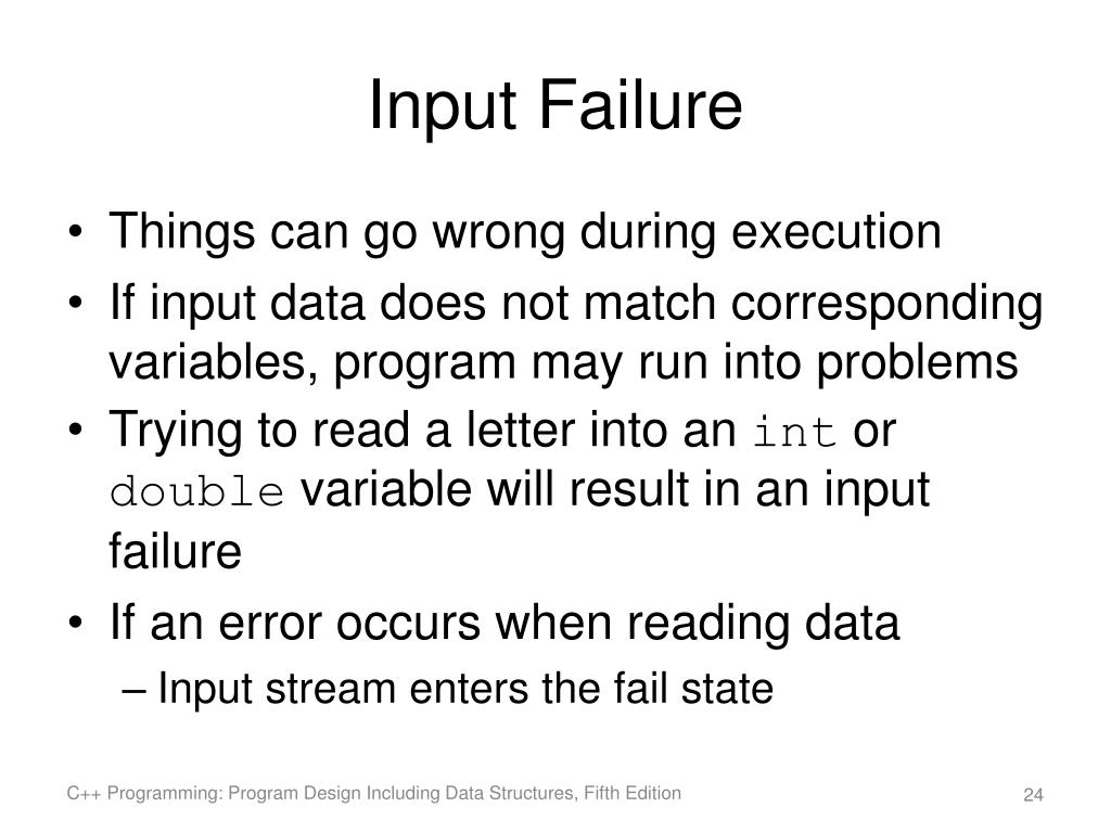 Input Failure • Things can go wrong during execution • If input data does not match corresponding variables, program may run into problems • Trying to read a letter into an int or double variable will result in an input failure • If an error occurs when reading data • Input stream enters the fail state C++ Programming: Program Design Including Data Structures, Fifth Edition