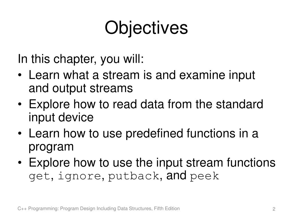 Objectives In this chapter, you will: • Learn what a stream is and examine input and output streams • Explore how to read data from the standard input device • Learn how to use predefined functions in a program • Explore how to use the input stream functions get, ignore, putback, and peek C++ Programming: Program Design Including Data Structures, Fifth Edition