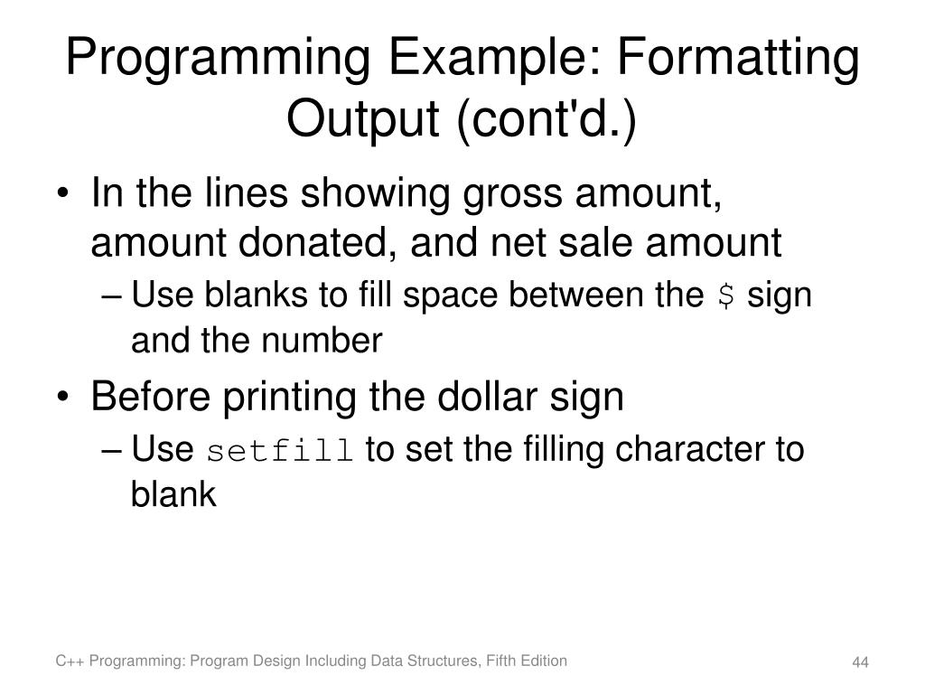 Programming Example: Formatting Output (cont'd.) • In the lines showing gross amount, amount donated, and net sale amount • Use blanks to fill space between the $ sign and the number • Before printing the dollar sign • Use setfill to set the filling character to blank C++ Programming: Program Design Including Data Structures, Fifth Edition
