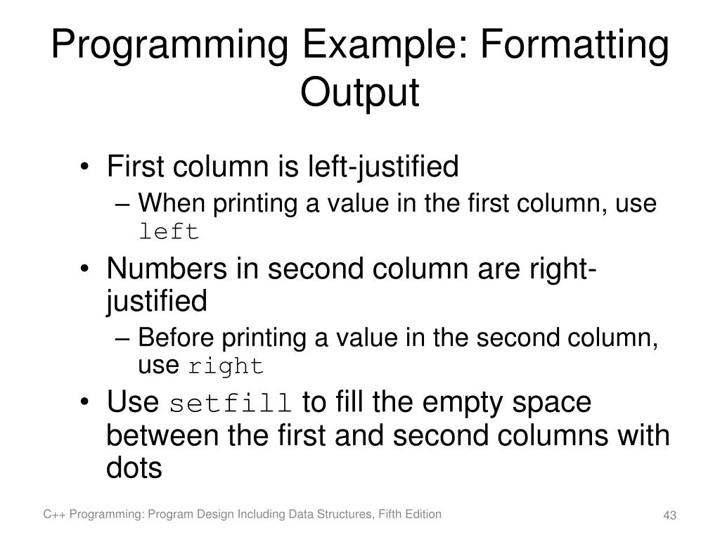 Programming Example: Formatting Output • First column is left-justified • When printing a value in the first column, use left • Numbers in second column are right-justified • Before printing a value in the second column, use right • Use setfill to fill the empty space between the first and second columns with dots C++ Programming: Program Design Including Data Structures, Fifth Edition