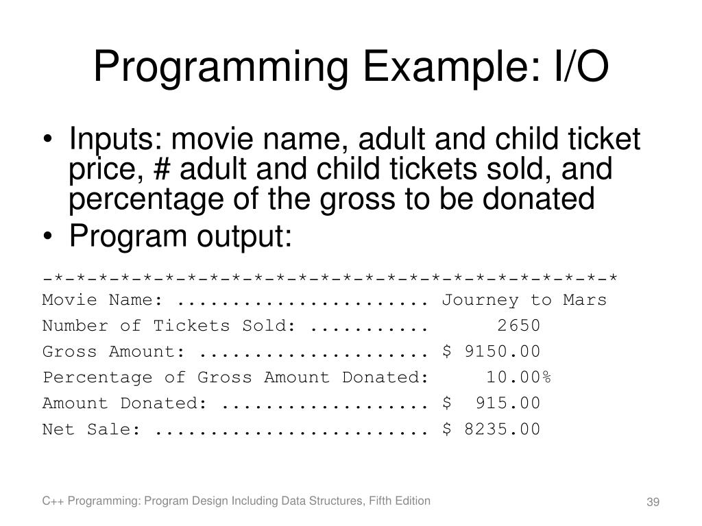 Programming Example: I/O • Inputs: movie name, adult and child ticket price, # adult and child tickets sold, and percentage of the gross to be donated • Program output: -*-*-*-*-*-*-*-*-*-*-*-*-*-*-*-*-*-*-*-*-*-*-*-*-*-* Movie Name: ....................... Journey to Mars Number of Tickets Sold: ........... 2650 Gross Amount: ..................... $ 9150.00 Percentage of Gross Amount Donated: 10.00% Amount Donated: ................... $ 915.00 Net Sale: ......................... $ 8235.00 C++ Programming: Program Design Including Data Structures, Fifth Edition