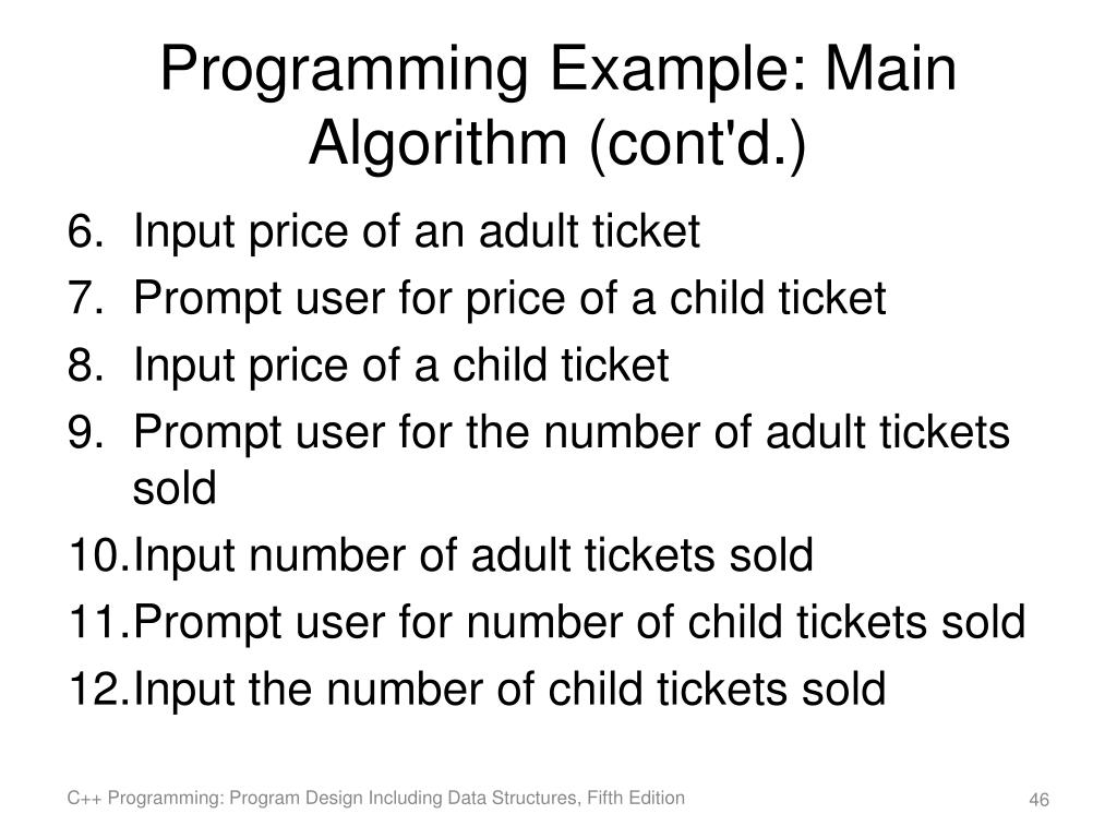Programming Example: Main Algorithm (cont'd.) • Input price of an adult ticket • Prompt user for price of a child ticket • Input price of a child ticket • Prompt user for the number of adult tickets sold • Input number of adult tickets sold • Prompt user for number of child tickets sold • Input the number of child tickets sold C++ Programming: Program Design Including Data Structures, Fifth Edition