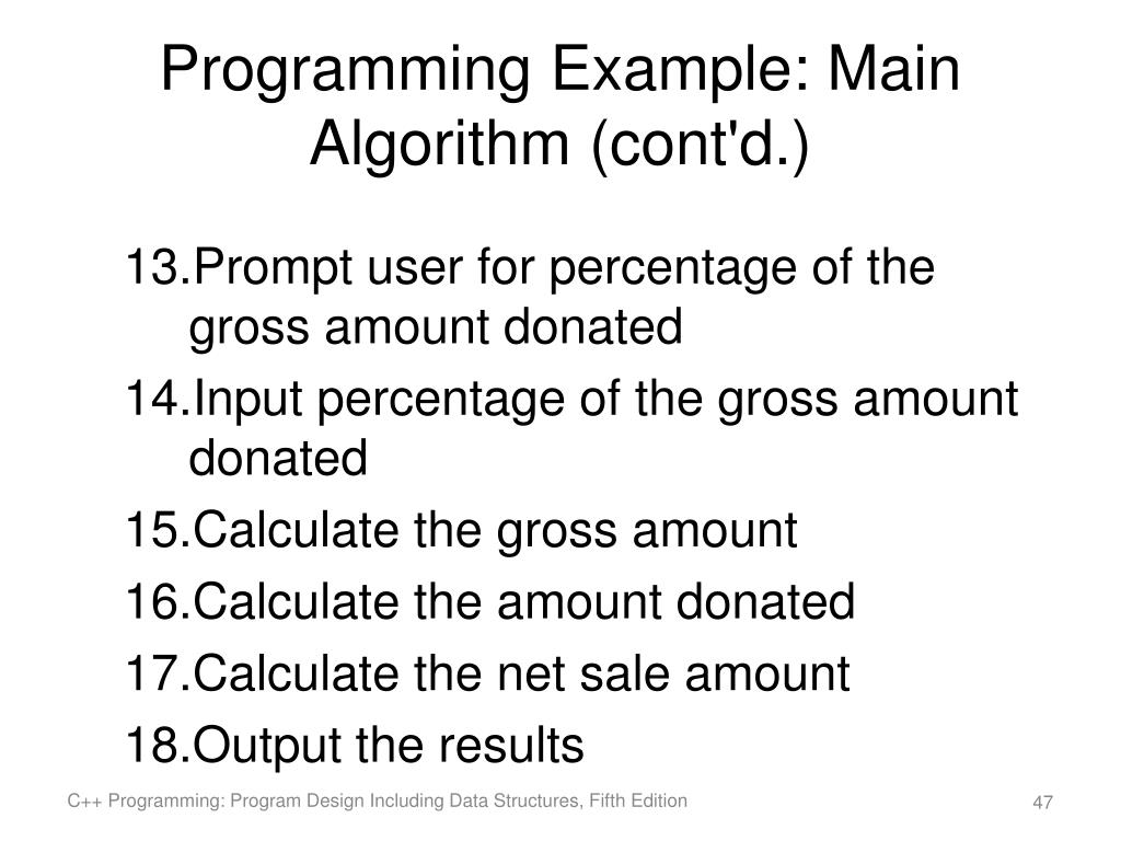 Programming Example: Main Algorithm (cont'd.) • Prompt user for percentage of the gross amount donated • Input percentage of the gross amount donated • Calculate the gross amount • Calculate the amount donated • Calculate the net sale amount • Output the results C++ Programming: Program Design Including Data Structures, Fifth Edition