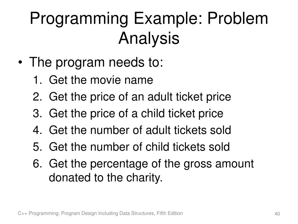 Programming Example: Problem Analysis • The program needs to: • Get the movie name • Get the price of an adult ticket price • Get the price of a child ticket price • Get the number of adult tickets sold • Get the number of child tickets sold • Get the percentage of the gross amount donated to the charity. C++ Programming: Program Design Including Data Structures, Fifth Edition