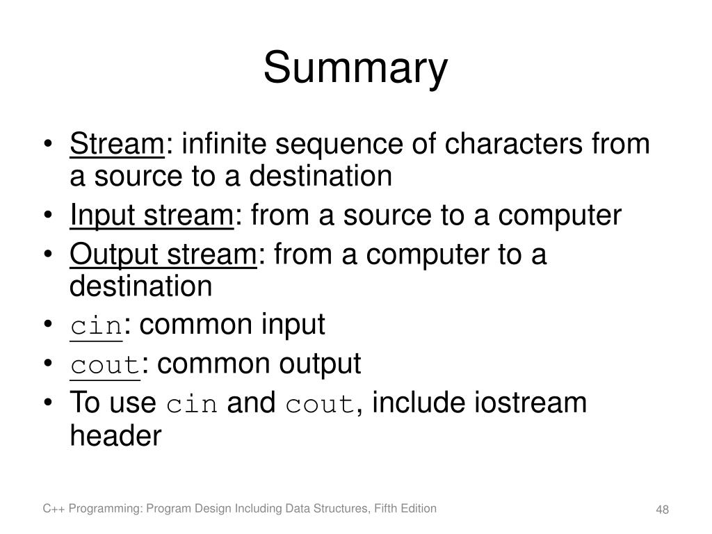 Summary • Stream: infinite sequence of characters from a source to a destination • Input stream: from a source to a computer • Output stream: from a computer to a destination • cin: common input • cout: common output • To use cin and cout, include iostream header C++ Programming: Program Design Including Data Structures, Fifth Edition