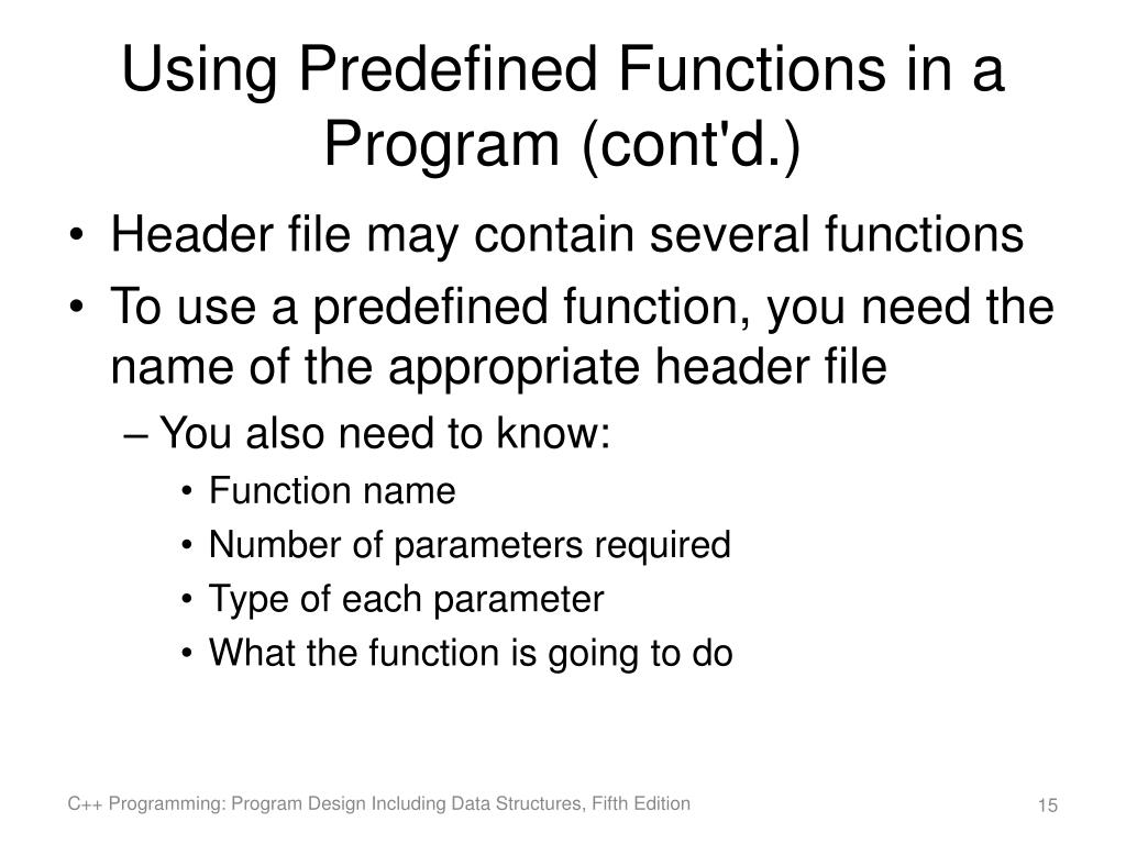 Using Predefined Functions in a Program (cont'd.) • Header file may contain several functions • To use a predefined function, you need the name of the appropriate header file • You also need to know: • Function name • Number of parameters required • Type of each parameter • What the function is going to do C++ Programming: Program Design Including Data Structures, Fifth Edition