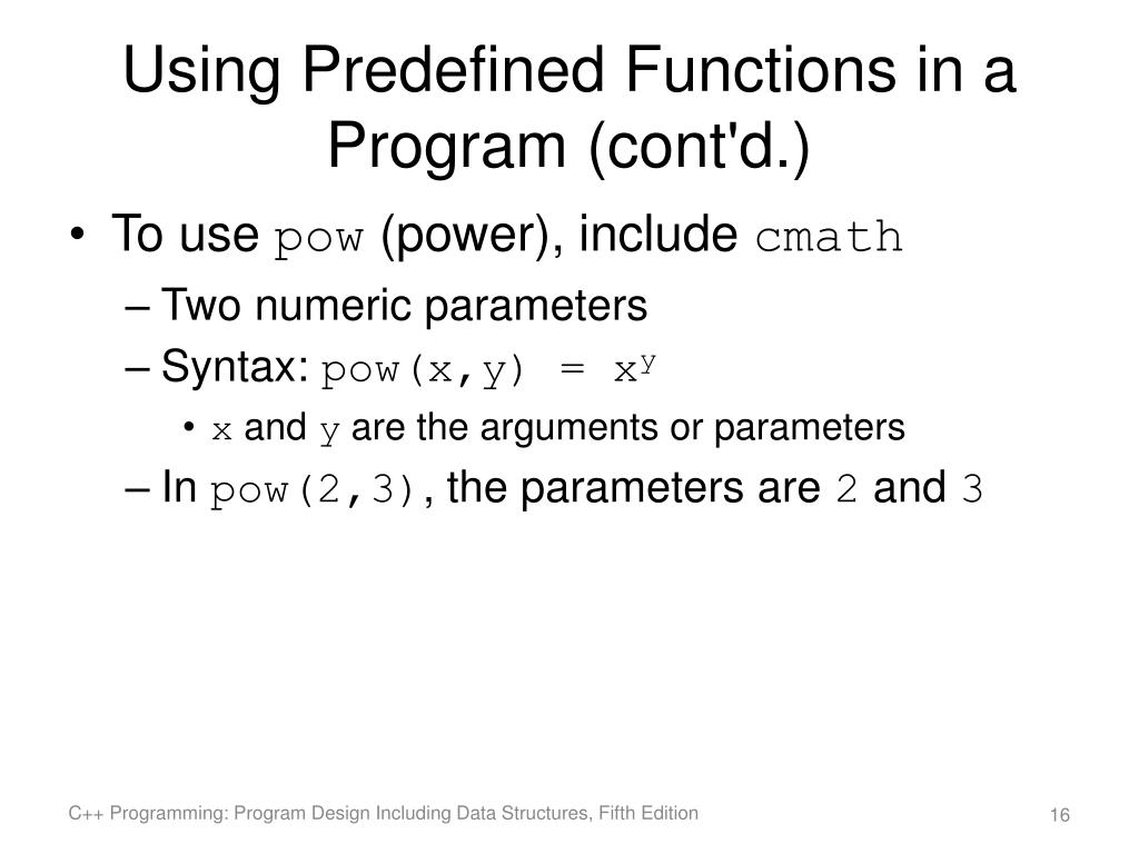 Using Predefined Functions in a Program (cont'd.) • To use pow (power), include cmath • Two numeric parameters • Syntax: pow(x,y) = xy • x and y are the arguments or parameters • In pow(2,3), the parameters are 2 and 3 C++ Programming: Program Design Including Data Structures, Fifth Edition