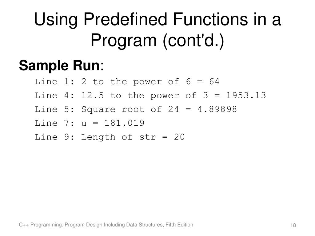 Using Predefined Functions in a Program (cont'd.) Sample Run: Line 1: 2 to the power of 6 = 64 Line 4: 12.5 to the power of 3 = 1953.13 Line 5: Square root of 24 = 4.89898 Line 7: u = 181.019 Line 9: Length of str = 20 C++ Programming: Program Design Including Data Structures, Fifth Edition
