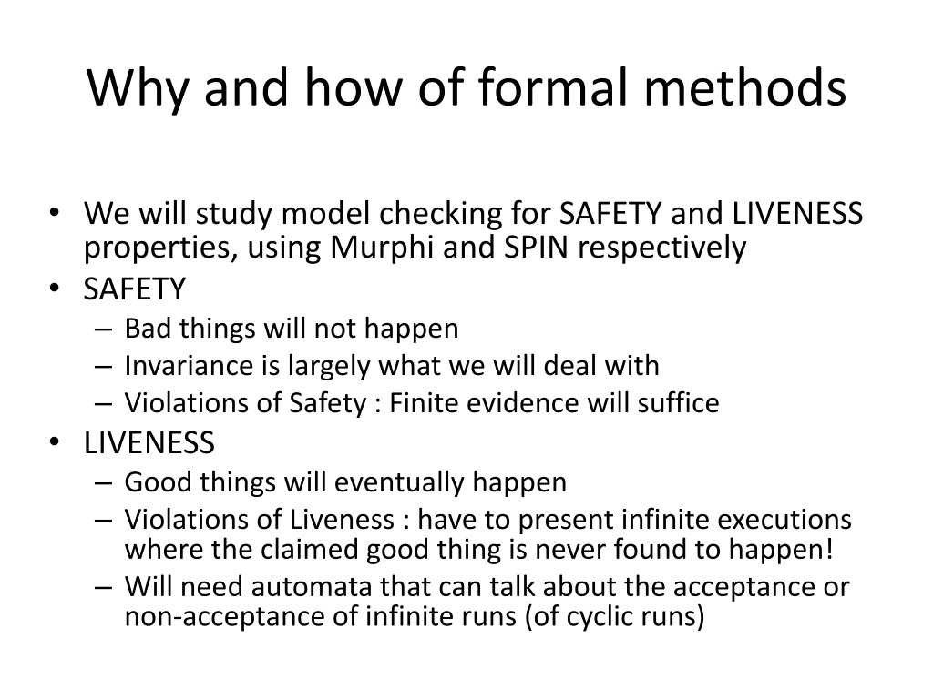 Why and how of formal methods • We will study model checking for SAFETY and LIVENESS properties, using Murphi and SPIN respectively • SAFETY • Bad things will not happen • Invariance is largely what we will deal with • Violations of Safety : Finite evidence will suffice • LIVENESS • Good things will eventually happen • Violations of Liveness : have to present infinite executions where the claimed good thing is never found to happen! • Will need automata that can talk about the acceptance or non-acceptance of infinite runs (of cyclic runs)