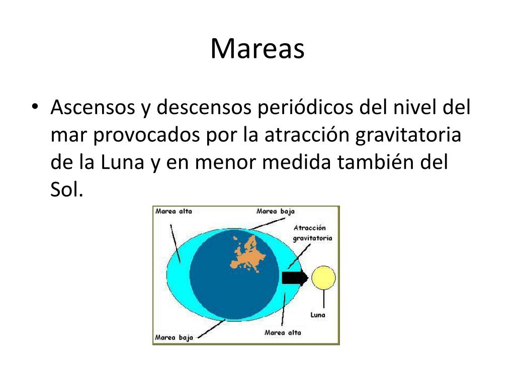Mareas • Ascensos y descensos periódicos del nivel del mar provocados por la atracción gravitatoria de la Luna y en menor medida también del Sol.