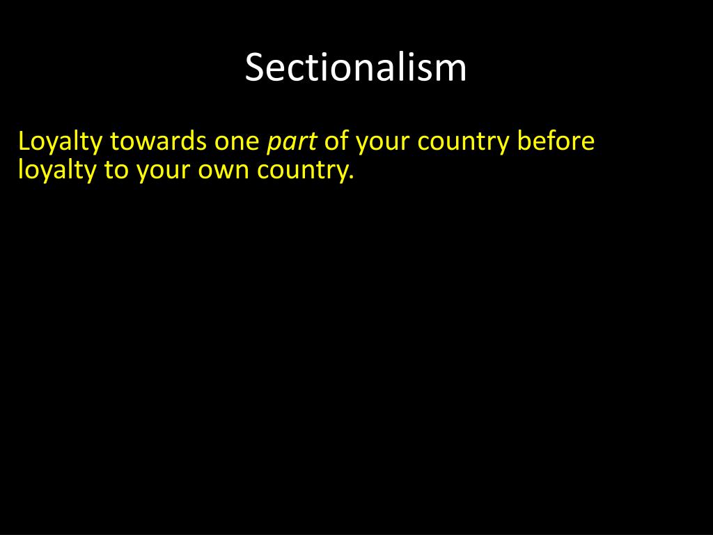 Sectionalism Loyalty towards one part of your country before loyalty to your own country. Sectionalism is present today when people talk about being proud to be a/an… a) American b) Southerner c) World Citizen d) Black / White / Latino / Asian