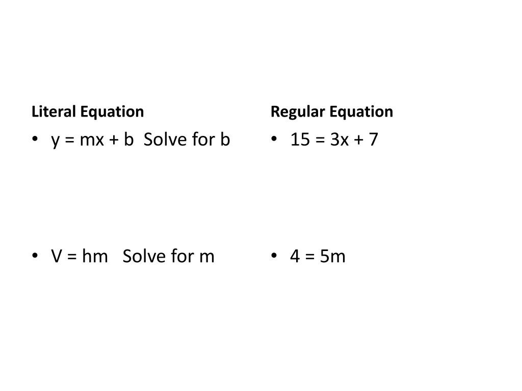 Literal Equation Regular Equation 15 = 3x + 7 4 = 5m • y = mx + b Solve for b • V = hm Solve for m
