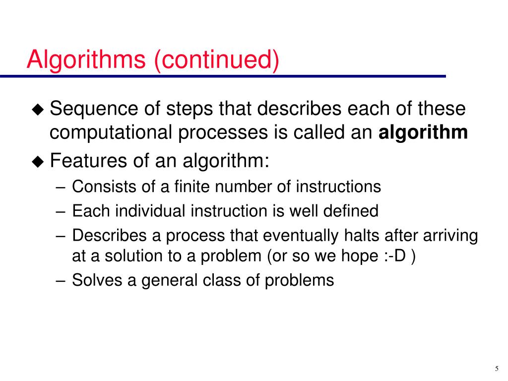 Algorithms (continued) • Sequence of steps that describes each of these computational processes is called an algorithm • Features of an algorithm: • Consists of a finite number of instructions • Each individual instruction is well defined • Describes a process that eventually halts after arriving at a solution to a problem (or so we hope :-D ) • Solves a general class of problems