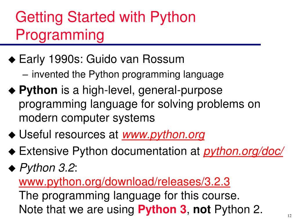 Getting Started with Python Programming • Early 1990s: Guido van Rossum • invented the Python programming language • Python is a high-level, general-purpose programming language for solving problems on modern computer systems • Useful resources at www.python.org • Extensive Python documentation atpython.org/doc/ • Python 3.2: www.python.org/download/releases/3.2.3The programming language for this course. Note that we are using Python 3, not Python 2.