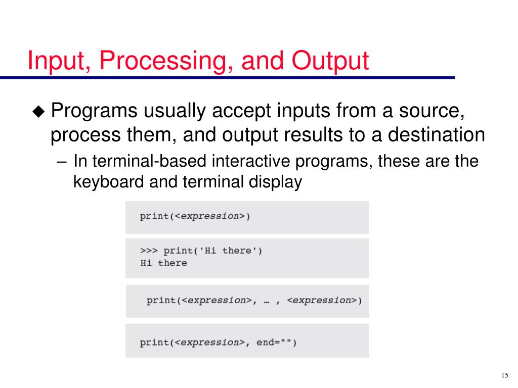 Input, Processing, and Output • Programs usually accept inputs from a source, process them, and output results to a destination • In terminal-based interactive programs, these are the keyboard and terminal display