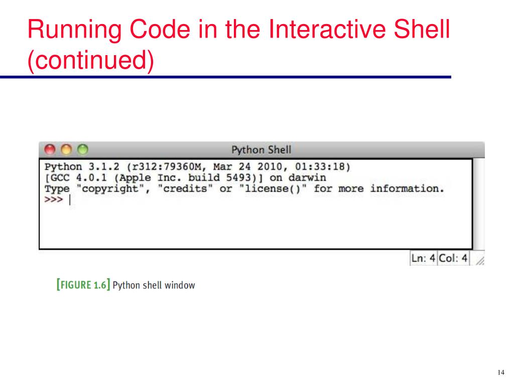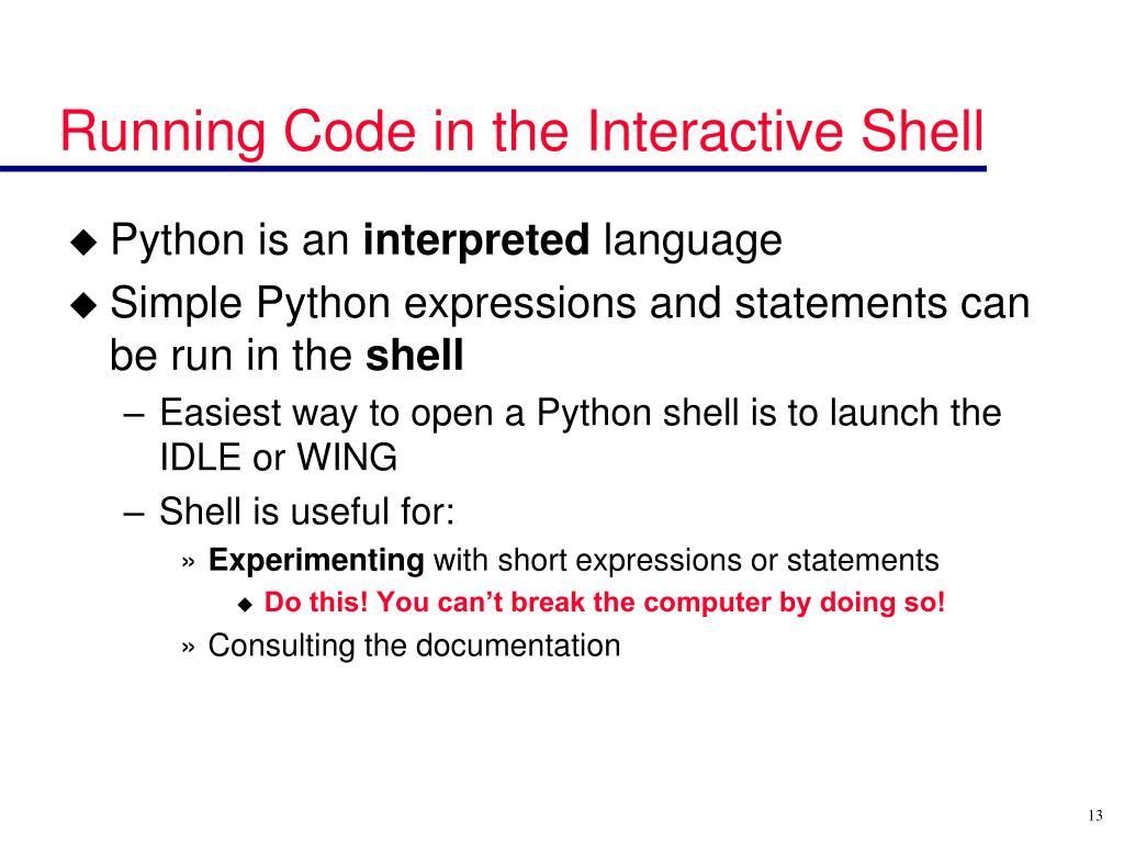 Running Code in the Interactive Shell • Python is an interpreted language • Simple Python expressions and statements can be run in the shell • Easiest way to open a Python shell is to launch the IDLE or WING • Shell is useful for: • Experimenting with short expressions or statements • Do this! You can’t break the computer by doing so! • Consulting the documentation