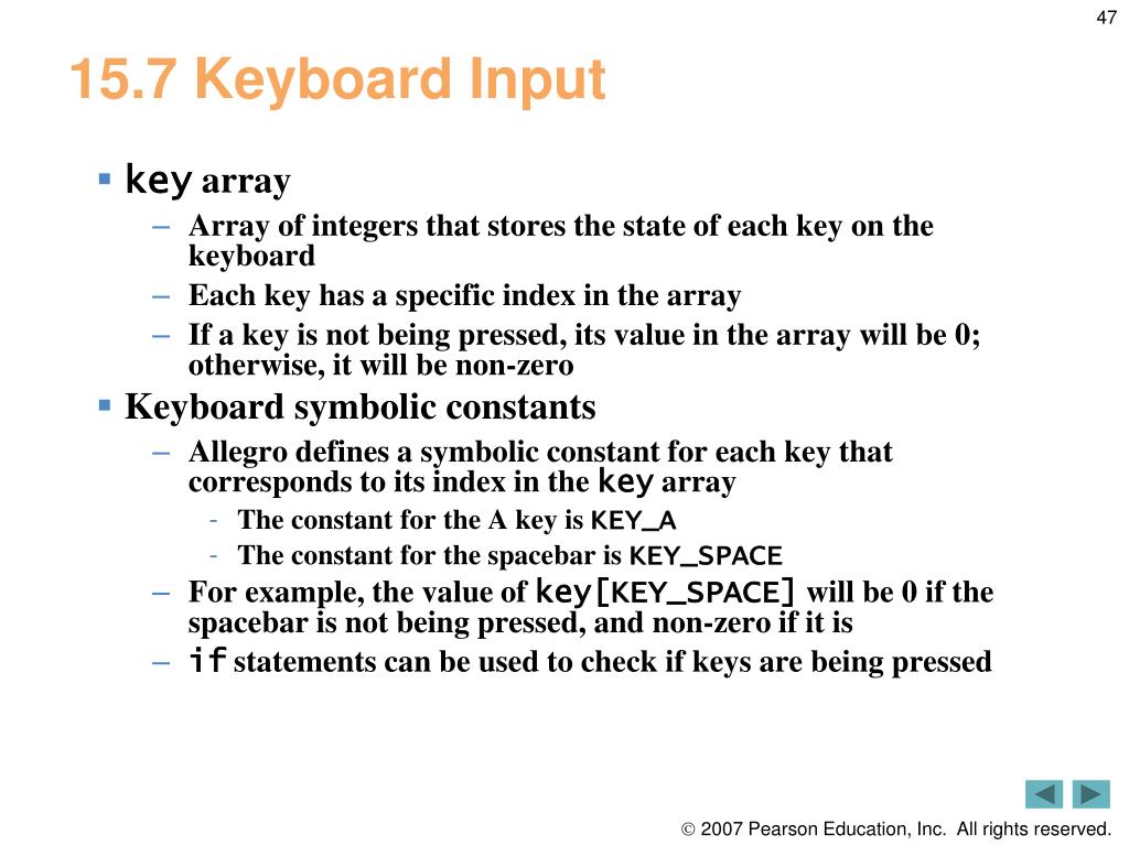 15.7 Keyboard Input • key array • Array of integers that stores the state of each key on the keyboard • Each key has a specific index in the array • If a key is not being pressed, its value in the array will be 0; otherwise, it will be non-zero • Keyboard symbolic constants • Allegro defines a symbolic constant for each key that corresponds to its index in the key array • The constant for the A key is KEY_A • The constant for the spacebar is KEY_SPACE • For example, the value of key[KEY_SPACE] will be 0 if the spacebar is not being pressed, and non-zero if it is • if statements can be used to check if keys are being pressed