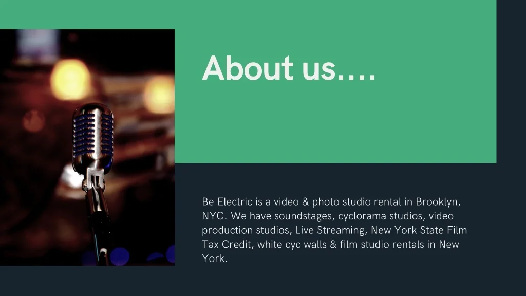 Aboutus.... BeElectricisavideo & photostudiorentalinBrooklyn, NYC. Wehavesoundstages, cycloramastudios, video productionstudios, LiveStreaming, NewYorkStateFilm TaxCredit, whitecycwalls & filmstudiorentalsinNew York.