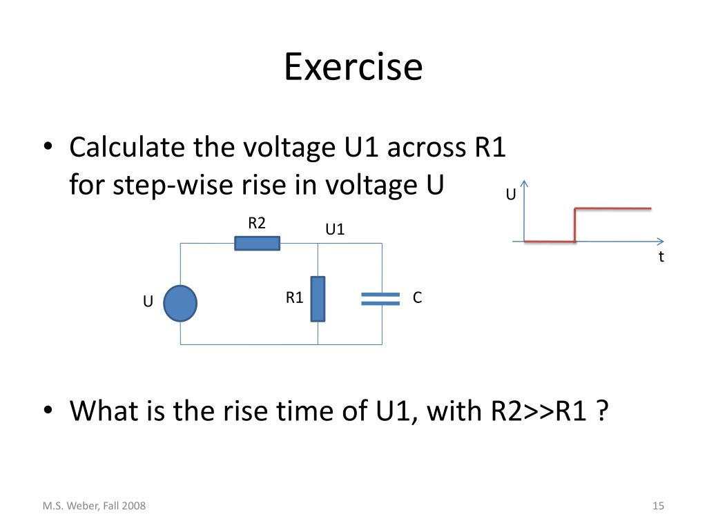 Exercise • Calculate the voltage U1 across R1for step-wise rise in voltage U • What is the rise time of U1, with R2>>R1 ? U R2 U1 t R1 C U