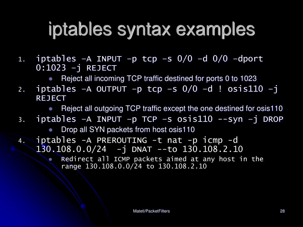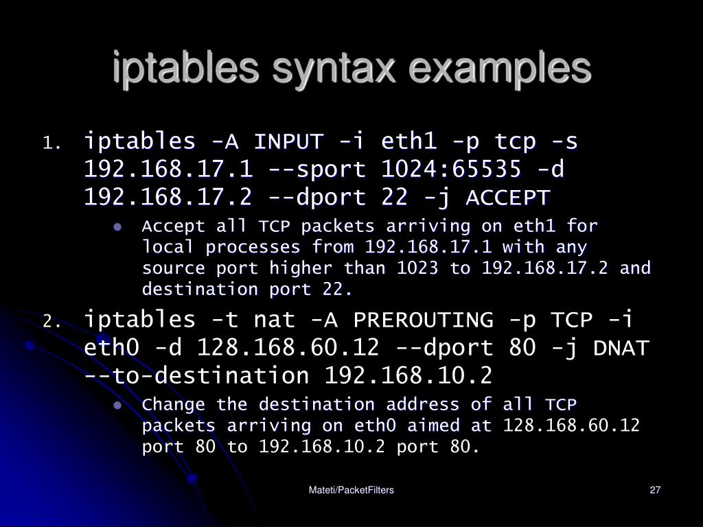 iptables syntax examples • iptables -A INPUT -i eth1 -p tcp -s 192.168.17.1 --sport 1024:65535 -d 192.168.17.2 --dport 22 -j ACCEPT • Accept all TCP packets arriving on eth1 for local processes from 192.168.17.1 with any source port higher than 1023 to 192.168.17.2 and destination port 22. • iptables -t nat -A PREROUTING -p TCP -i eth0 -d 128.168.60.12 --dport 80 -j DNAT --to-destination 192.168.10.2 • Change the destination address of all TCP packets arriving on eth0 aimed at 128.168.60.12 port 80 to 192.168.10.2 port 80. Mateti/PacketFilters