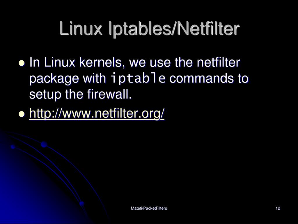 Linux Iptables/Netfilter • In Linux kernels, we use the netfilter package with iptablecommands to setup the firewall. • http://www.netfilter.org/ Mateti/PacketFilters