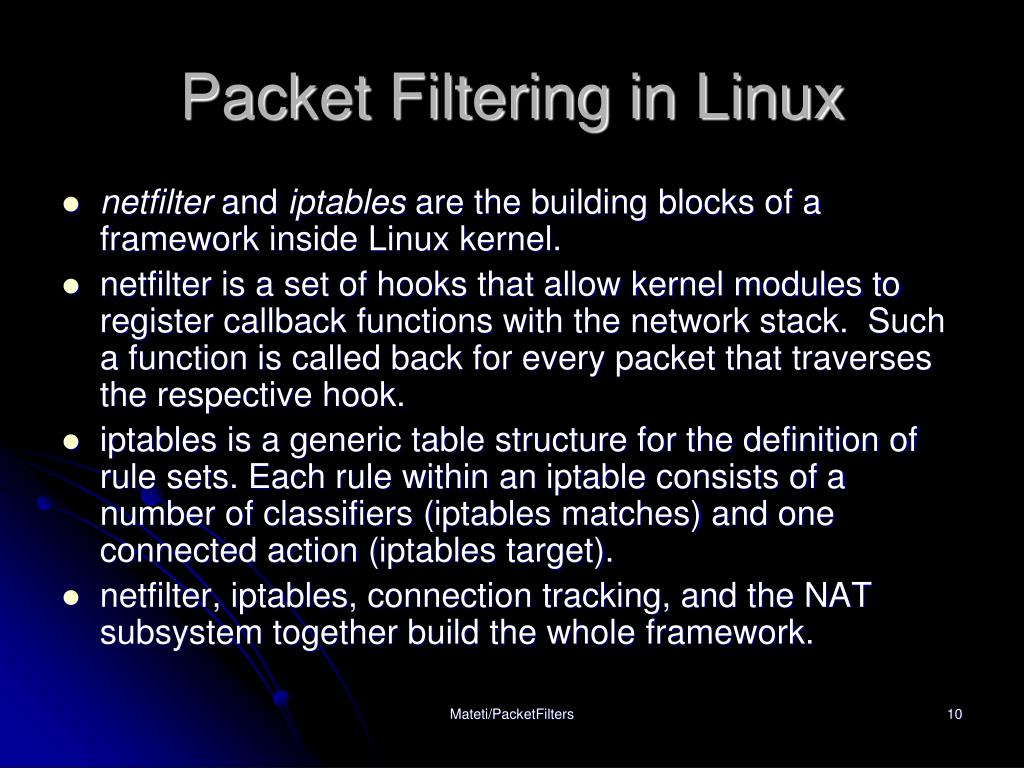 Packet Filtering in Linux • netfilter and iptables are the building blocks of a framework inside Linux kernel. • netfilter is a set of hooks that allow kernel modules to register callback functions with the network stack. Such a function is called back for every packet that traverses the respective hook. • iptables is a generic table structure for the definition of rule sets. Each rule within an iptable consists of a number of classifiers (iptables matches) and one connected action (iptables target). • netfilter, iptables, connection tracking, and the NAT subsystem together build the whole framework. Mateti/PacketFilters