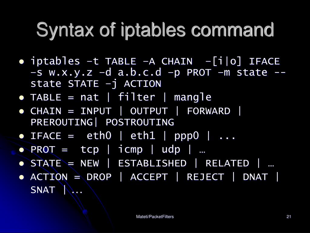 Syntax of iptables command • iptables –t TABLE –A CHAIN –[i|o] IFACE –s w.x.y.z –d a.b.c.d –p PROT –m state --state STATE –j ACTION • TABLE = nat | filter | mangle • CHAIN = INPUT | OUTPUT | FORWARD | PREROUTING| POSTROUTING • IFACE = eth0 | eth1 | ppp0 | ... • PROT = tcp | icmp | udp | … • STATE = NEW | ESTABLISHED | RELATED | … • ACTION = DROP | ACCEPT | REJECT | DNAT | SNAT | … Mateti/PacketFilters