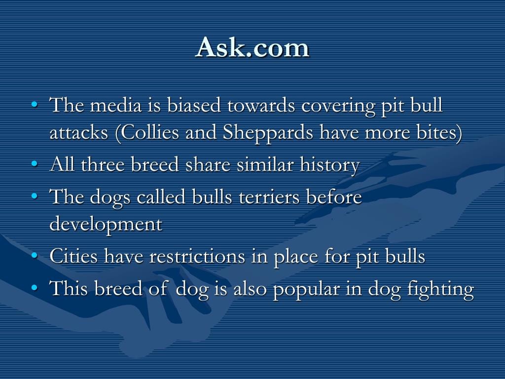 Ask.com • The media is biased towards covering pit bull attacks (Collies and Sheppards have more bites) • All three breed share similar history • The dogs called bulls terriers before development • Cities have restrictions in place for pit bulls • This breed of dog is also popular in dog fighting