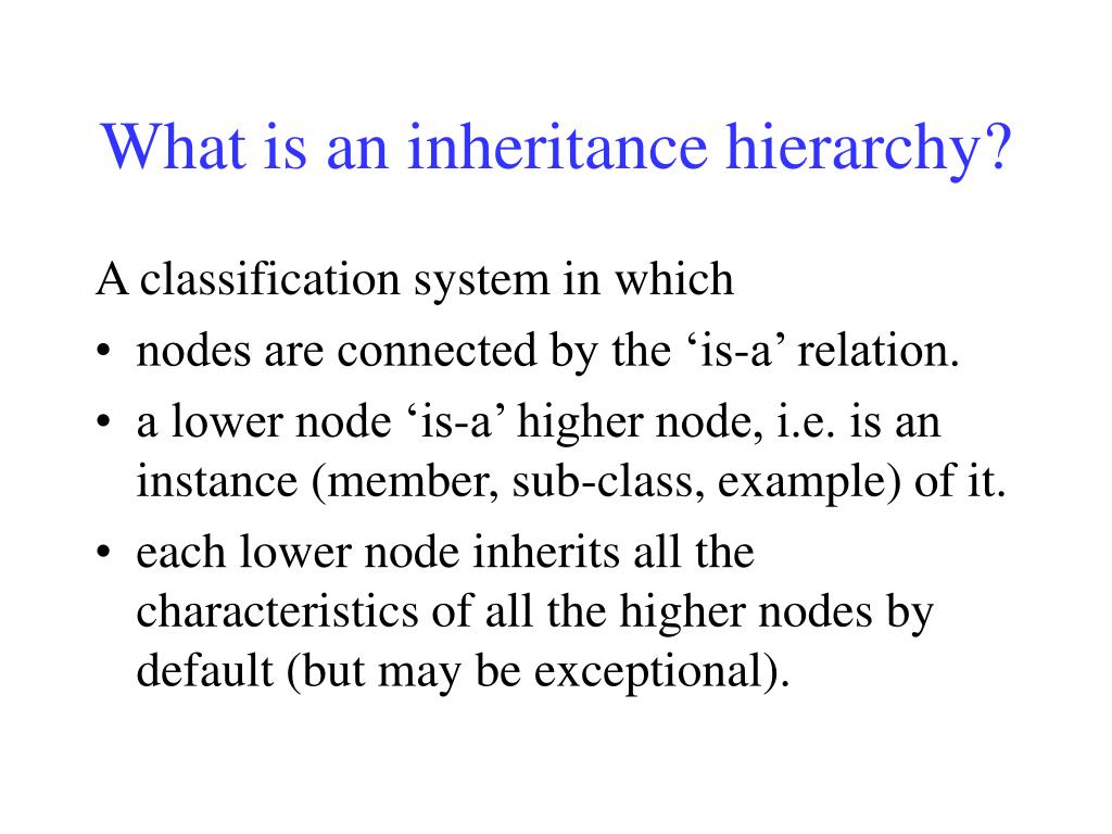 What is an inheritance hierarchy? A classification system in which • nodes are connected by the ‘is-a’ relation. • a lower node ‘is-a’ higher node, i.e. is an instance (member, sub-class, example) of it. • each lower node inherits all the characteristics of all the higher nodes by default (but may be exceptional).