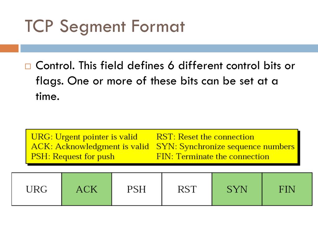 TCP Segment Format • Control. This field defines 6 different control bits or flags. One or more of these bits can be set at a time.