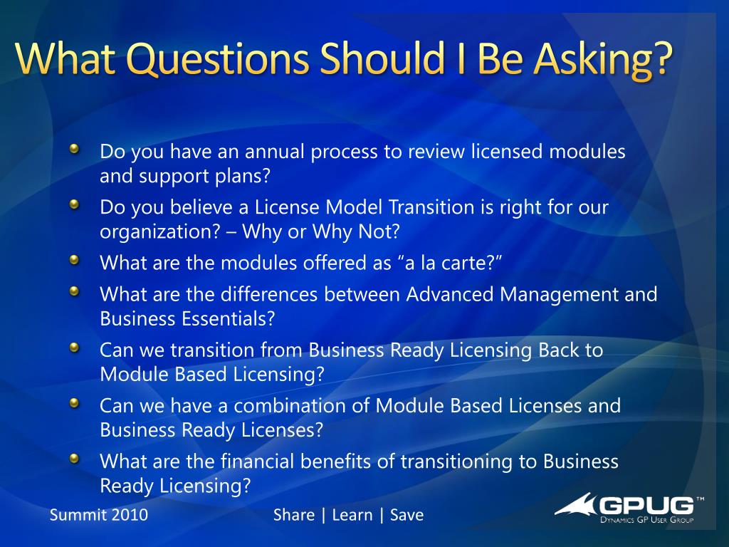 What Questions Should I Be Asking? • What Licensing Methodology Are We Using (Module Based Licensing or Business Ready Licensing?) • Would it make business sense for us to transition to Business Ready Licensing (if you are currently a MBL Customer?) • What is the cost of a License Model Transition to BRL? • What Microsoft Dynamics GP Service Plan are we registered for? • Should we re-evaluate the various Microsoft Dynamics GP Service Plans regarding our usage/needs over the past year? • How do I access the knowledge base articles on CustomerSource? • What are the benefits/new features of Microsoft Dynamics GP 2010? – Would these new features benefit our business? If so, why?