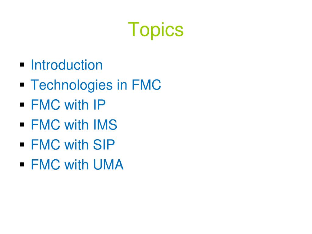 Topics • Introduction • Technologies in FMC • FMC with IP • FMC with IMS • FMC with SIP • FMC with UMA