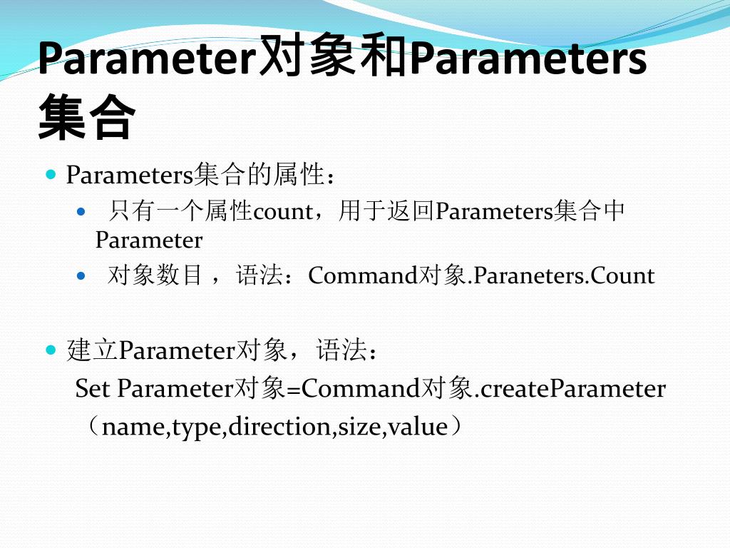 Command对象的Execute方法的参数: Command对象的方法(续) • CreateParameter:创造一个新的Parameter对象(参数对象),主要是进行参数查询的时候使用