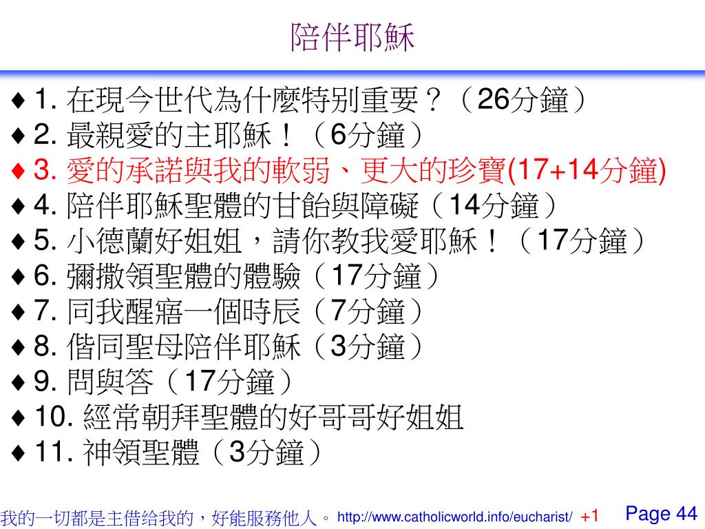 陪伴耶穌 • 1. 在現今世代為什麼特别重要?(26分鐘) • 2. 最親愛的主耶穌!(6分鐘) • 3. 愛的承諾與我的軟弱、更大的珍寶(17+14分鐘) • 4. 陪伴耶穌聖體的甘飴與障礙(14分鐘) • 5. 小德蘭好姐姐,請你教我愛耶穌!(17分鐘) • 6. 彌撒領聖體的體驗(17分鐘) • 7. 同我醒寤一個時辰(7分鐘) • 8. 偕同聖母陪伴耶穌(3分鐘) • 9. 問與答(17分鐘) • 10. 經常朝拜聖體的好哥哥好姐姐 • 11. 神領聖體(3分鐘) +1