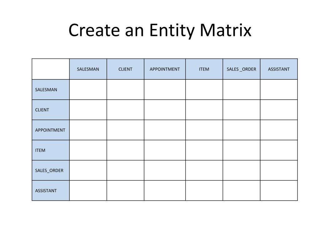 Exercise • Complete the rest of the Matrix. Look for direct relationships among the following: • SALESMAN /APPOINTMENT • APPOINTMENT/ SALESMAN • SALESMAN /ITEM • ITEM/ SALESMAN • SALESMAN /SALES_ORDER • SALES_ORDER/ SALESMAN • SALESMAN /ASSISTANT • ASSISTANT/SALESMAN • CLIENT/APPOINTMENT • APPOINTMENT/CLIENT • ...
