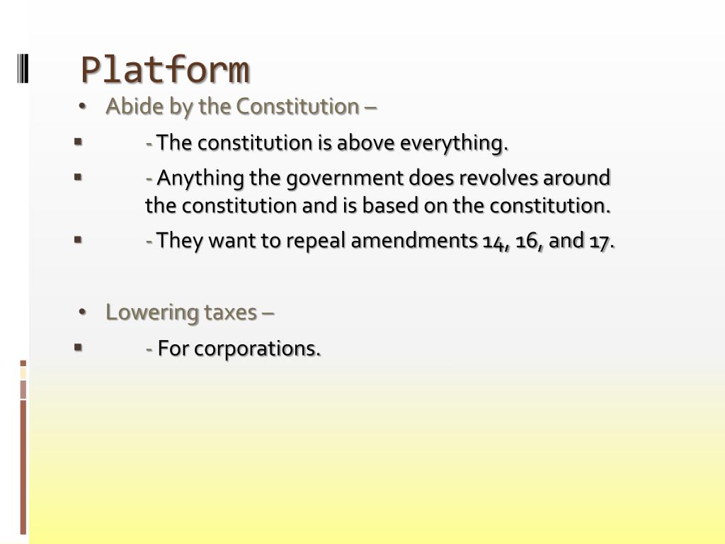 Platform • Abide by the Constitution – • - The constitution is above everything. • - Anything the government does revolves around the constitution and is based on the constitution. • - They want to repeal amendments 14, 16, and 17. • Lowering taxes – • - For corporations.