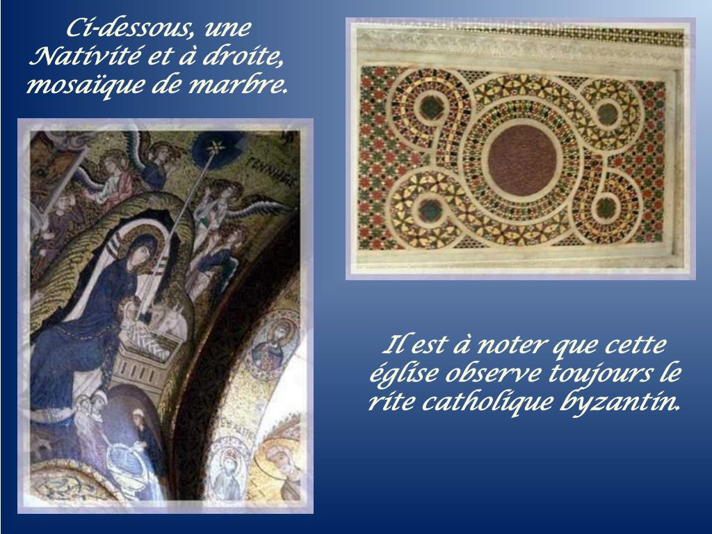 Ci-dessous, une Nativité et à droite, mosaïque de marbre. Il est à noter que cette église observe toujours le rite catholique byzantin.
