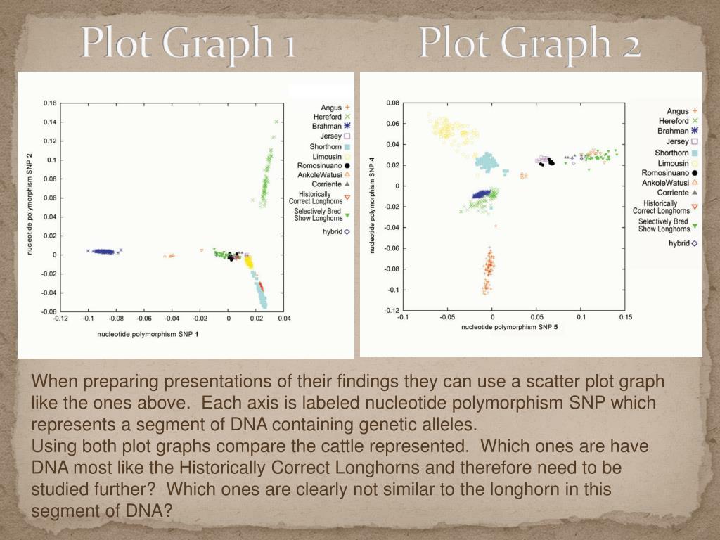 Plot Graph 1 Plot Graph 2 When preparing presentations of their findings they can use a scatter plot graph like the ones above. Each axis is labeled nucleotide polymorphism SNP which represents a segment of DNA containing genetic alleles. Using both plot graphs compare the cattle represented. Which ones are have DNA most like the Historically Correct Longhorns and therefore need to be studied further? Which ones are clearly not similar to the longhorn in this segment of DNA?