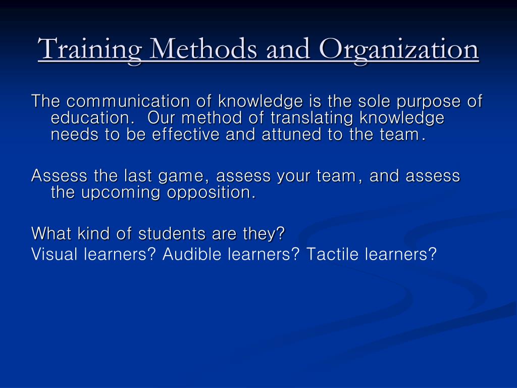 Training Methods and Organization The communication of knowledge is the sole purpose of education. Our method of translating knowledge needs to be effective and attuned to the team. Assess the last game, assess your team, and assess the upcoming opposition. What kind of students are they? Visual learners? Audible learners? Tactile learners?